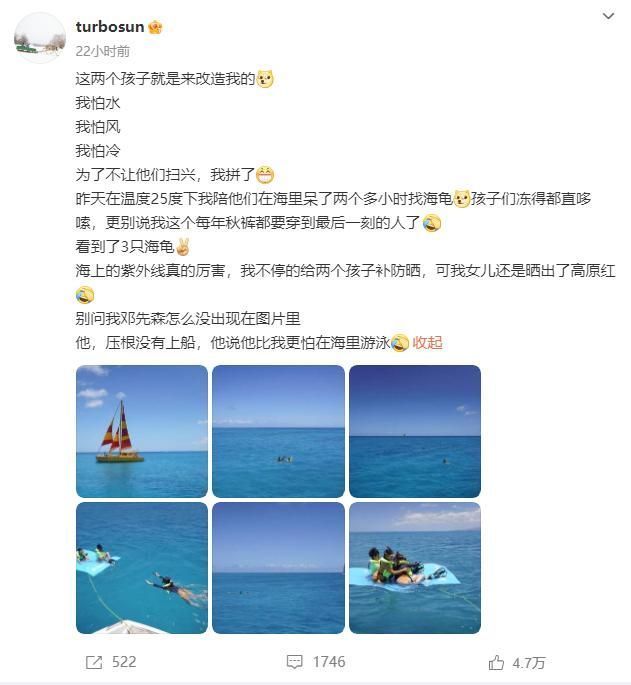 从孙俪的发文中可以看到,她自己本人是怕水、怕风、怕冷的人,但因为孩子想要出海找海龟,为了不让孩子失望,孙俪最终还是决定陪同孩子一起出海,对此她还调侃道:“我拼了。”